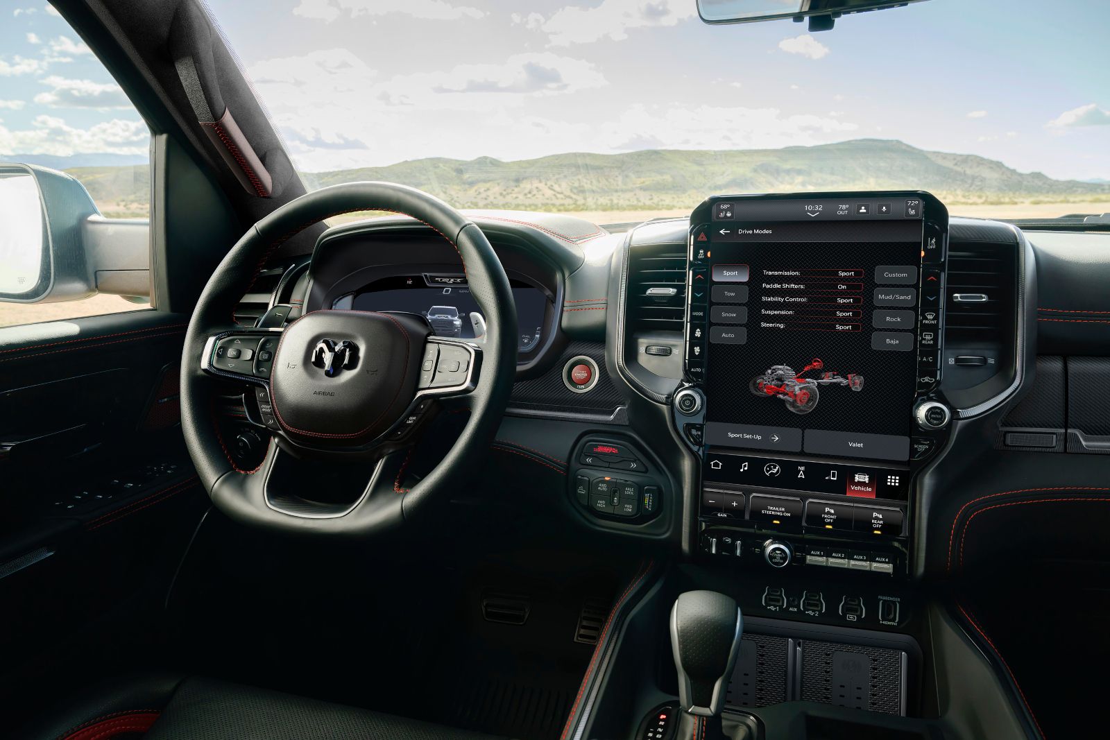 Pour la première fois, le TRX présente un couvercle d'airbag enveloppé de cuir avec surpiqûres rouges, un ciel de pavillon en daim complet et des pare-soleil enveloppés de daim, des détails empruntés au Ram 1500 Tungsten. Des garnitures en fibre de carbone véritable encadrent le groupe d'instruments numériques, couvrent le couvercle supérieur de la boîte à gants et accentent les panneaux de porte garnis de cuir et l'embout de console arrière.